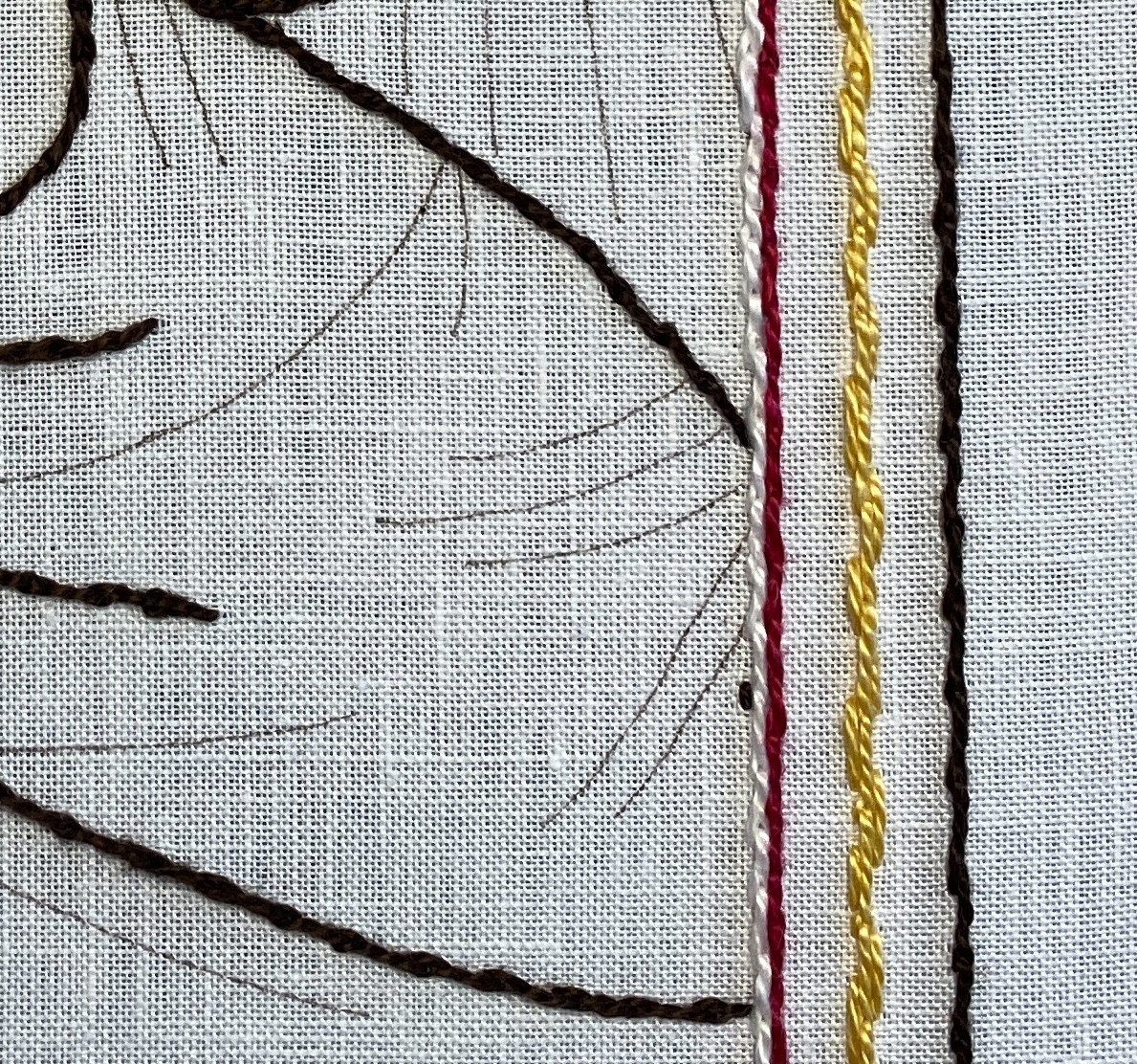 The instructions have a very useful photo of the project in progress, and this is a portion of the frame. The center column of lightest gold, including the dashed stitching lines, visually take up a bit more than a third of the frame width.